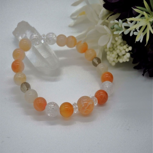 ドラゴンアゲート・クラック水晶・スモーキークォーツ 「龍の力をまとう石」と言われる浄化力の高い石ドラゴンアゲートと、プレッシャーをものともせずに輝く石クラック水晶、そして、グラウンディングの石スモーキークォーツを組み合わせた、無敵の開拓者ブレスが出来ました ドラゴンアゲートというと、通常はクラックを入れたアゲートに、黒い染料を流し込むためどちらかというと男性的な雰囲気のものが多いのですが、こちらはシャーベットオレンジで、可愛らしく仕上がりました 起業や新しい活動のお守りにどうぞ