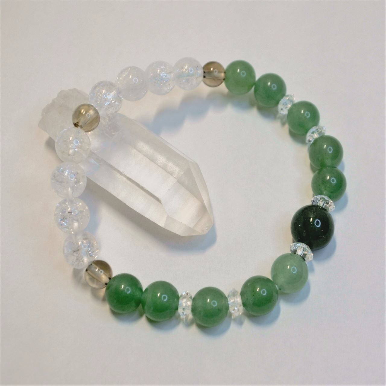 心身の疲れをいやしてくれるアベンチュリンに、大地と繋がるエネルギーの高い天然のスモーキークォーツと、浄化力が高くネガティブな気を希望に変えてくれるクラック水晶を組み合わせました。