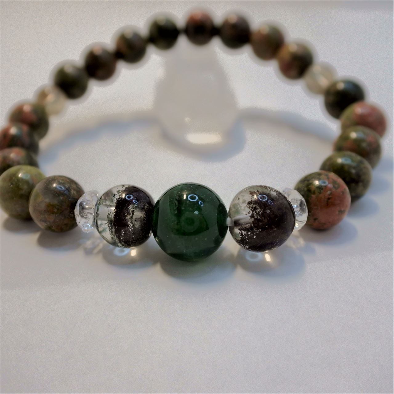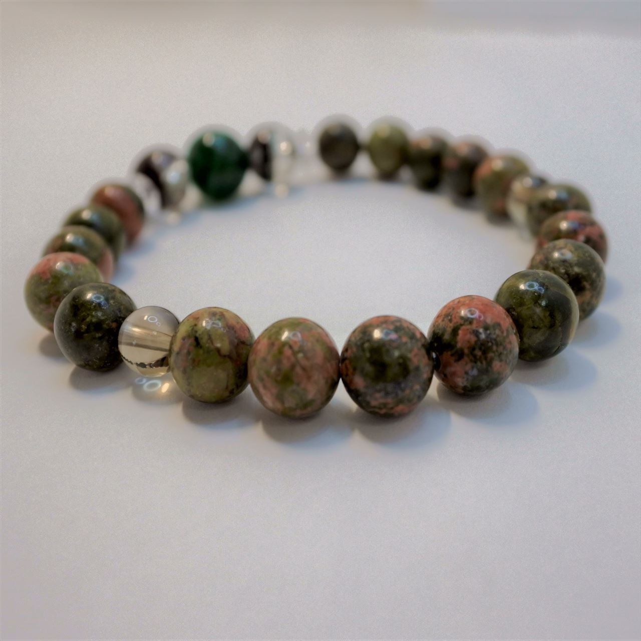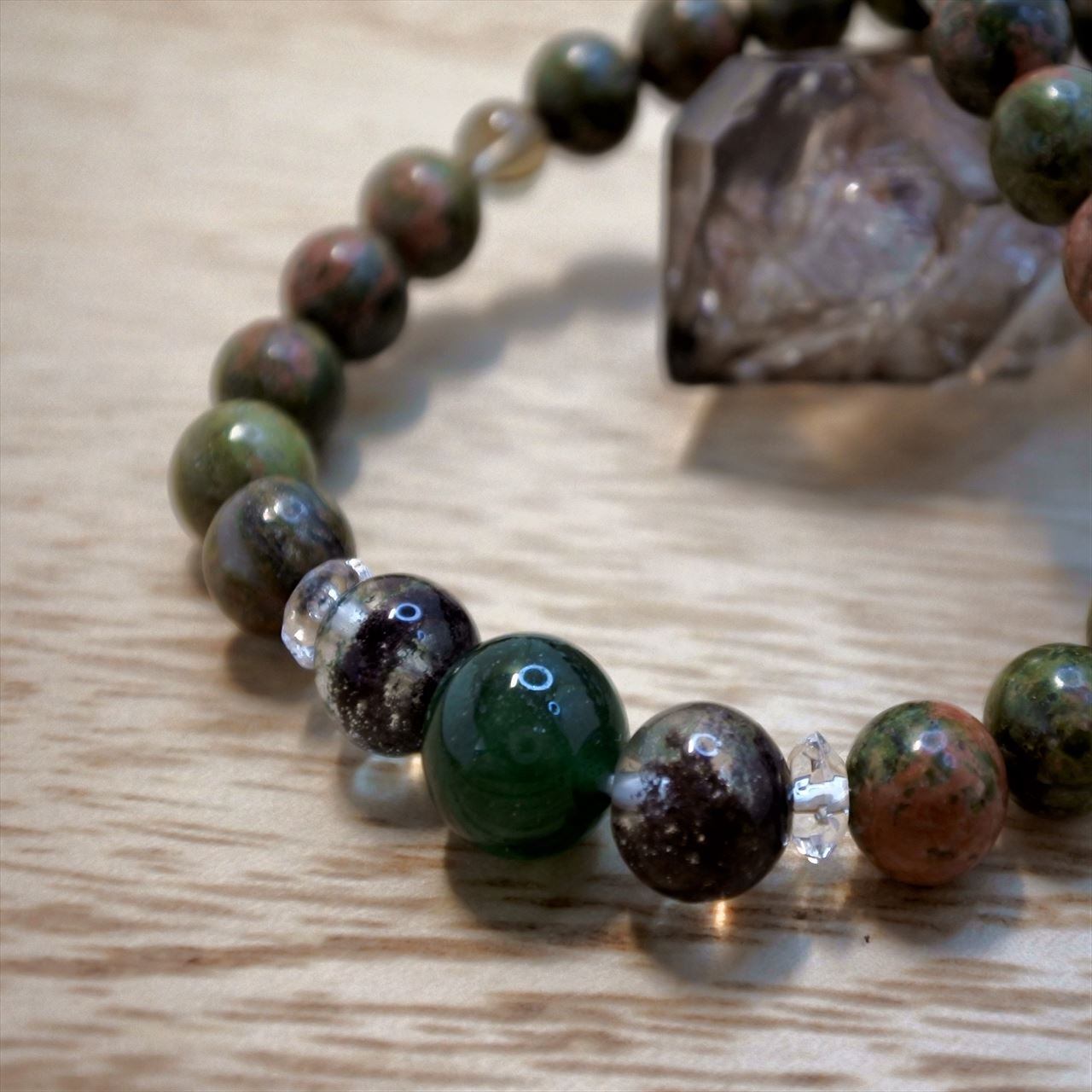 このブレスレットには、柔らかなエネルギーで不安を癒してくれるユナカイトと、感情のバランスをとってくれるグリーンアベンチュリン、そして、大地の豊かさをもたらすガーデンクォーツを組み込みました