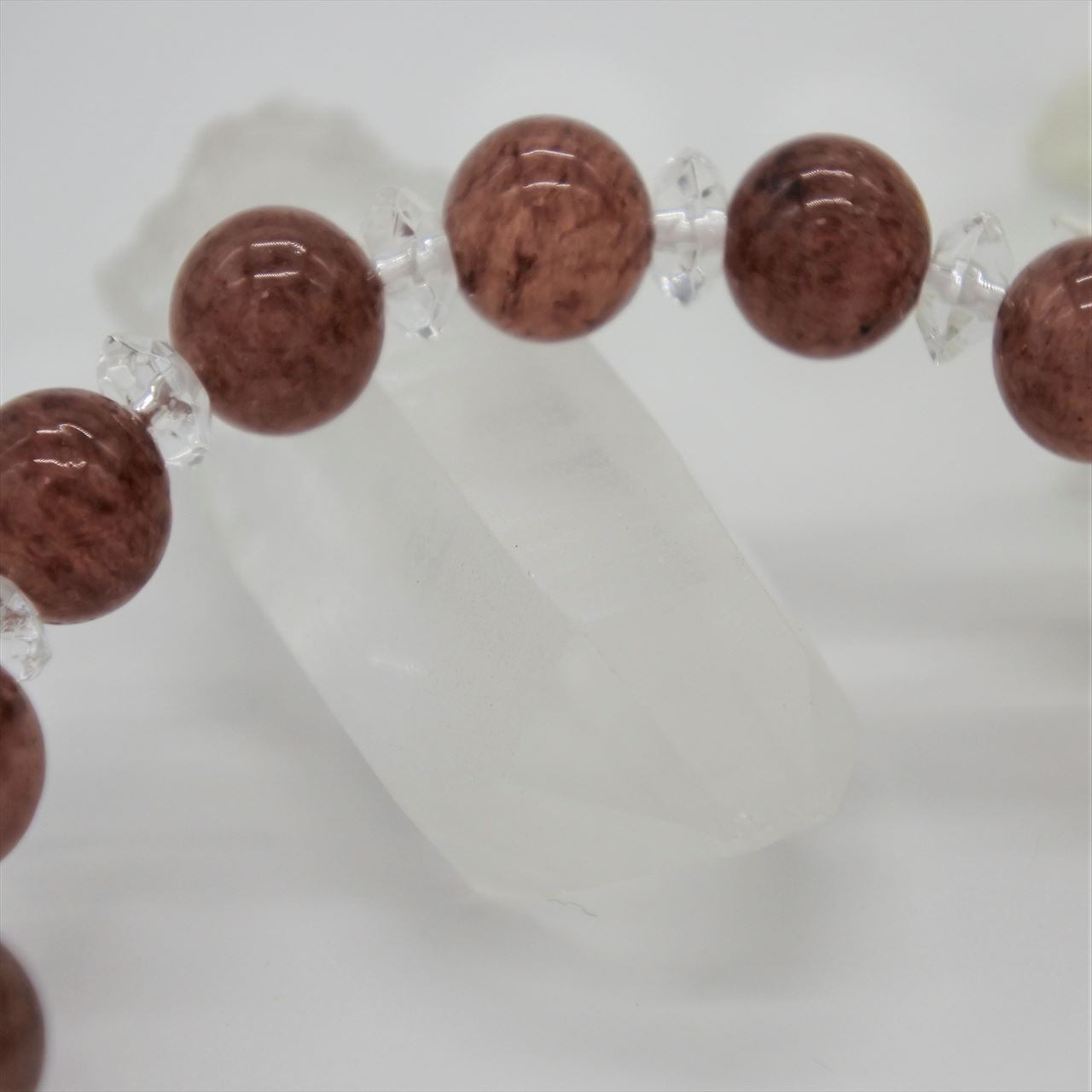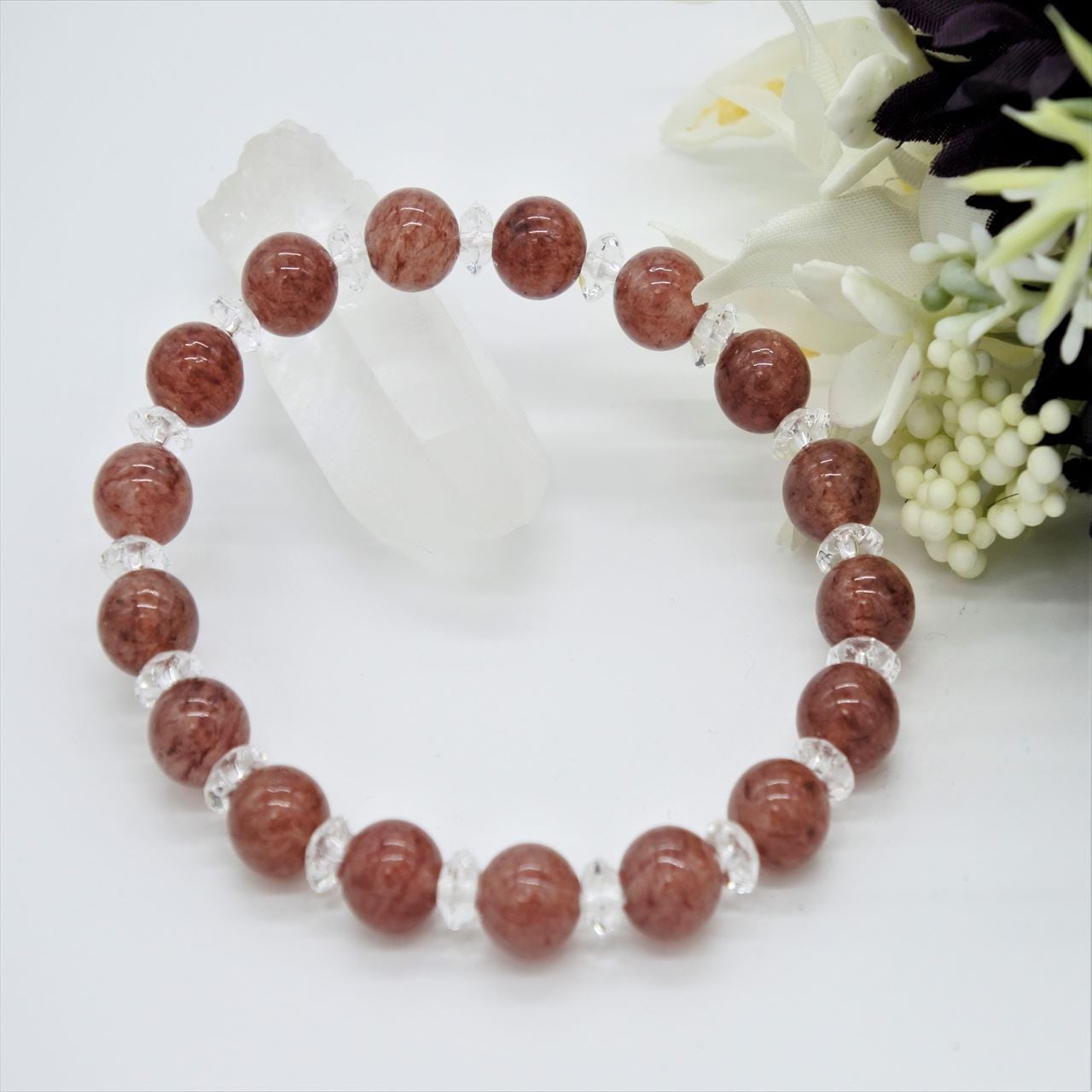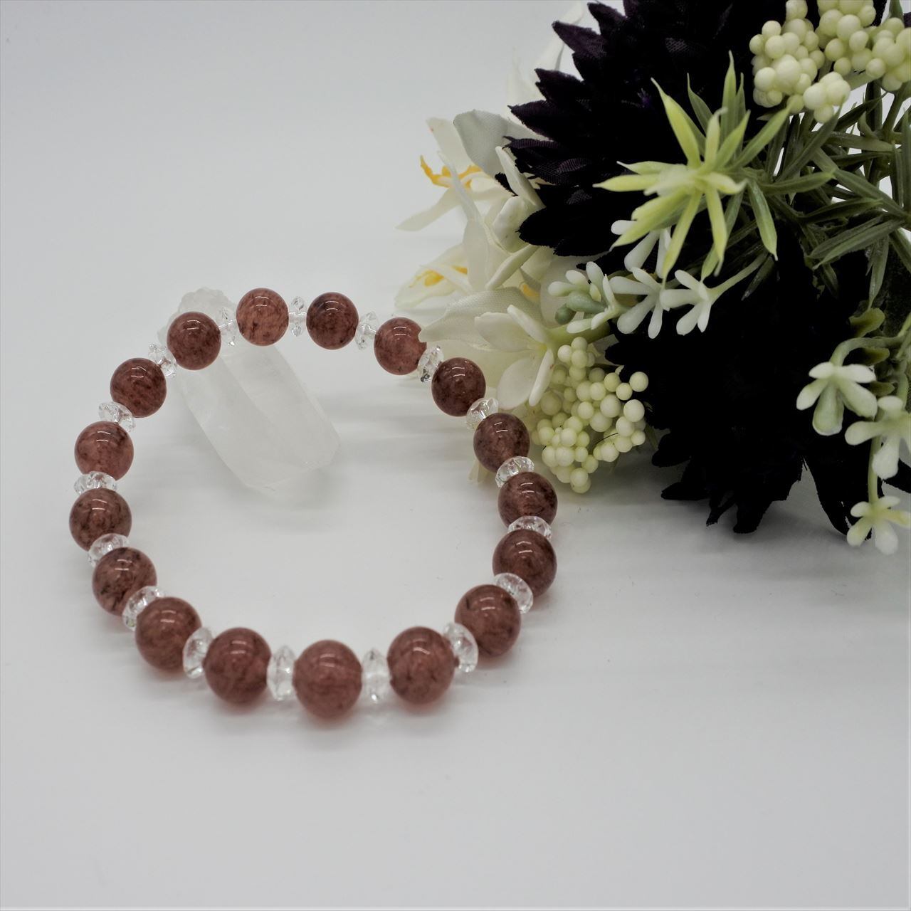 自己愛を高めてくれる石、マンガノエピドートインクォーツ(アフリカンストロベリークォーツ)に、浄化力が高く隣り合う石の性質を強化してくれる万能選手の水晶を組み合わせました