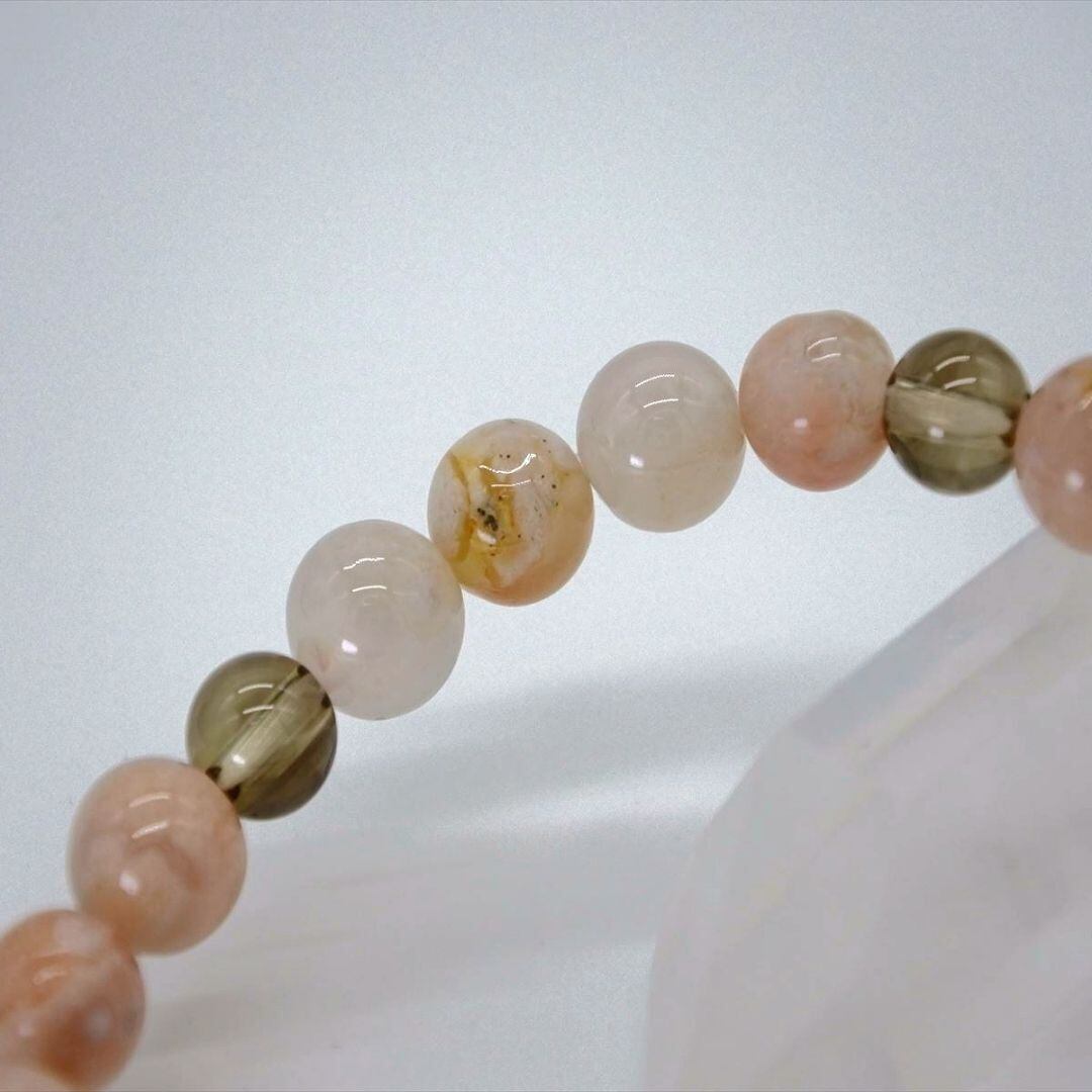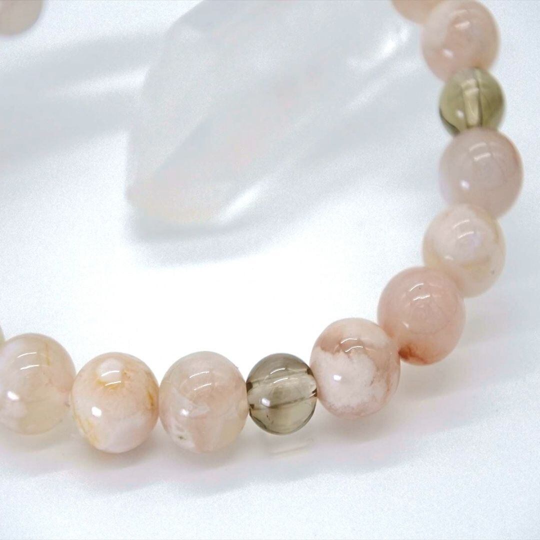 可憐な花のようなチェリーブロッサムアゲートに、天然のスモーキークォーツを組み合わせました