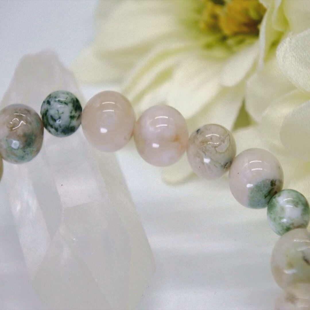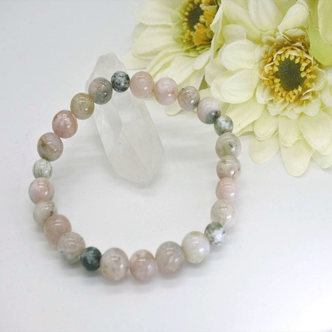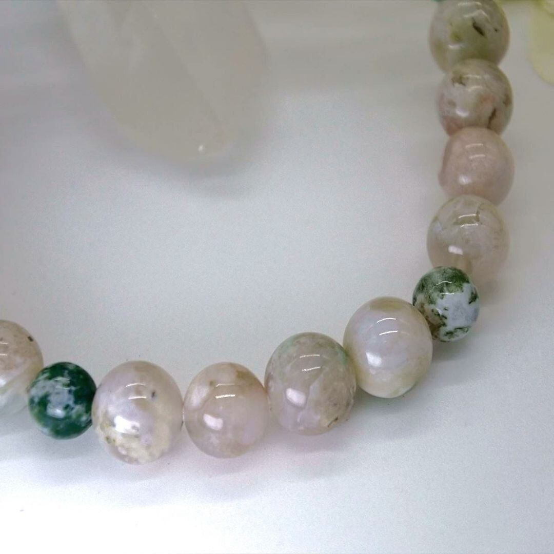 緑色の混じったピンクベージュのチェリーブロッサムアゲートの、若々しいエネルギーを苔メノウとも呼ばれるモスアゲートの、成長を促し豊かな実りを得るエネルギー