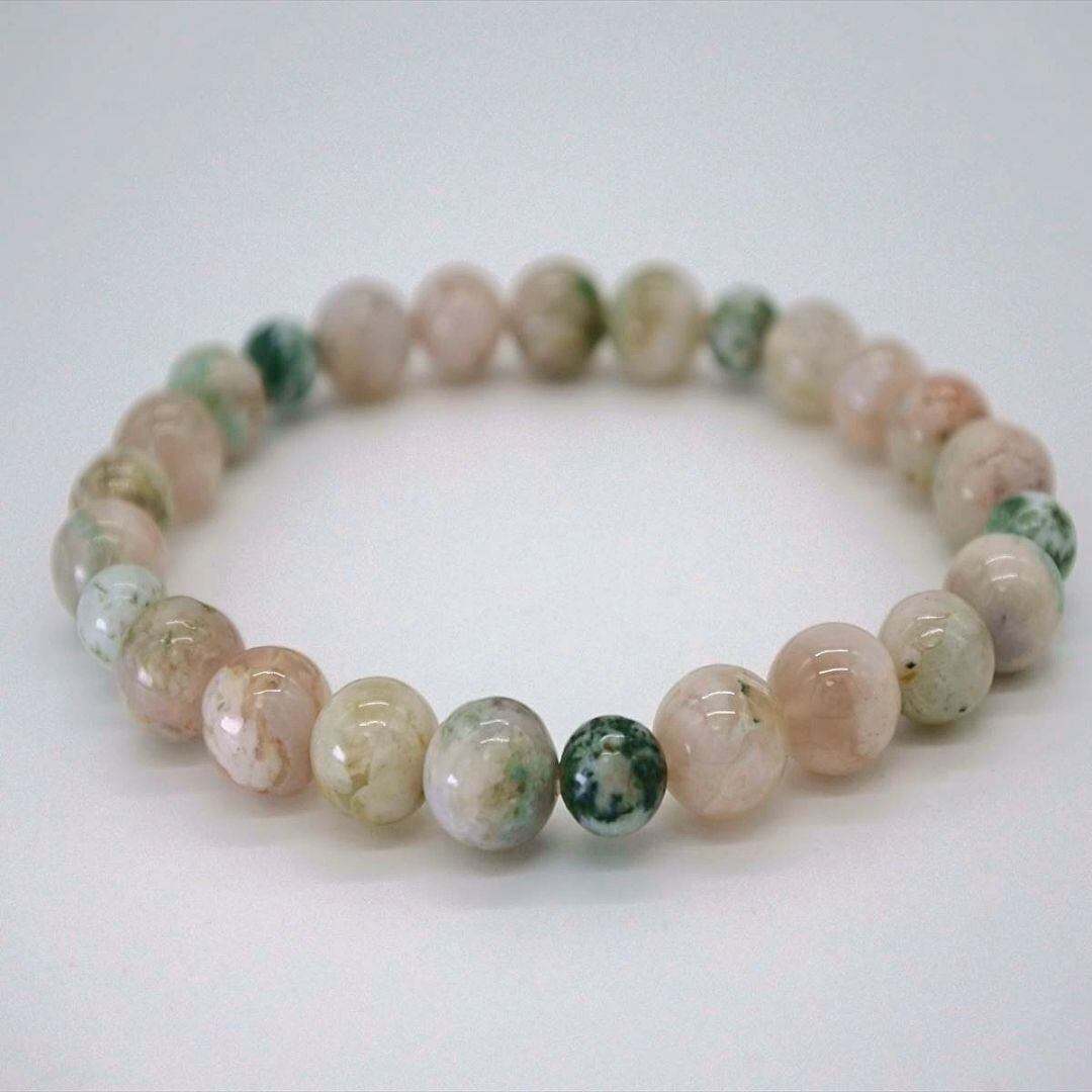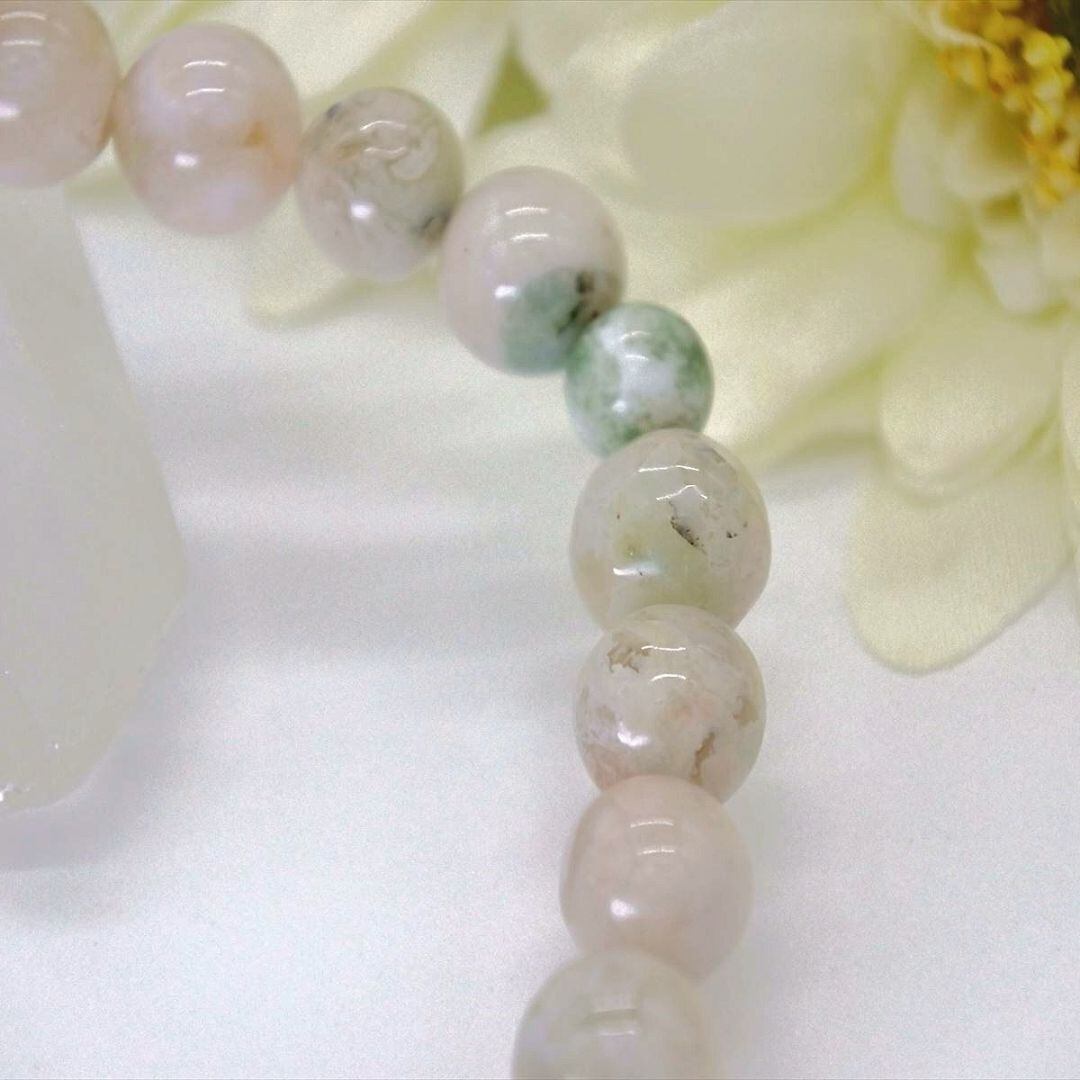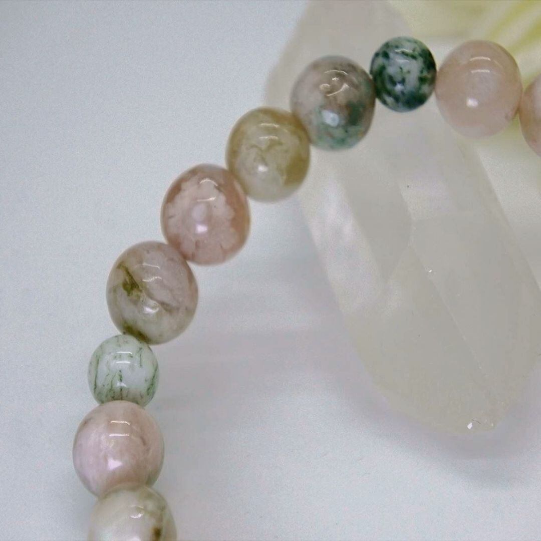 緑色の混じったピンクベージュのチェリーブロッサムアゲートの、若々しいエネルギーを苔メノウとも呼ばれるモスアゲートの、成長を促し豊かな実りを得るエネルギー