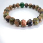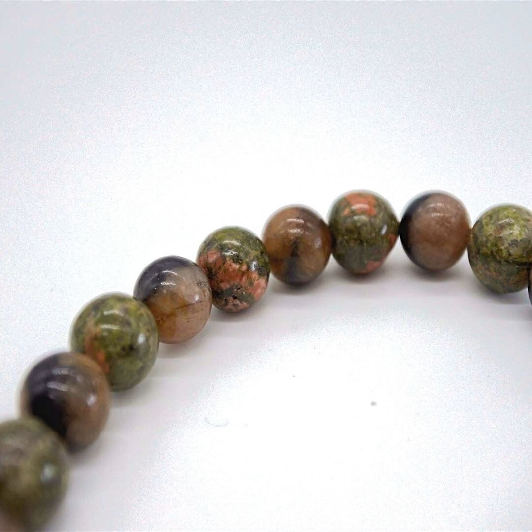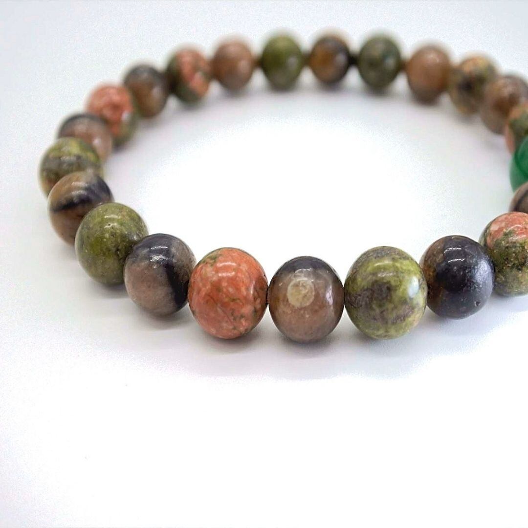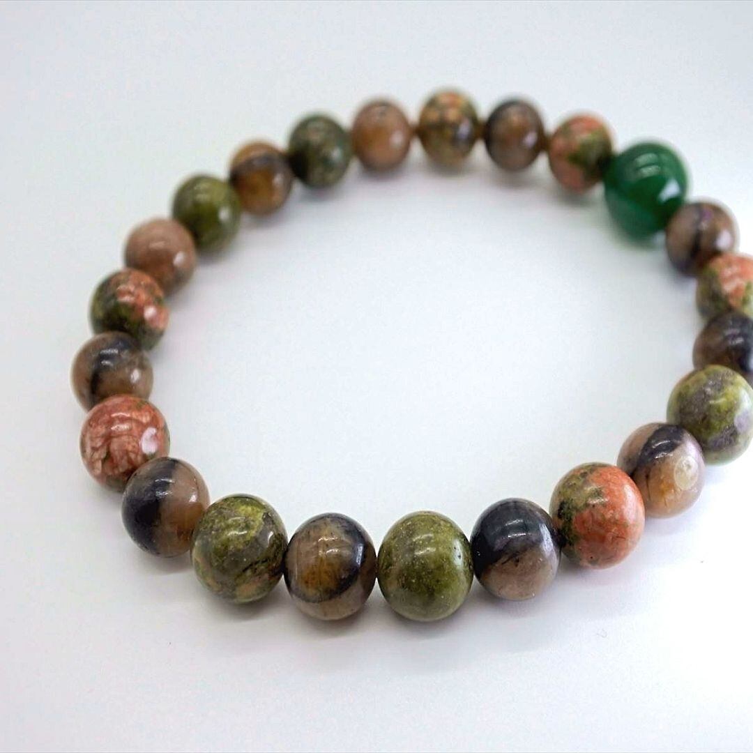 ハートを癒し大地とつなげ、心の安定へと導いてくれるユナカイトは、私自身も助けてもらった、とてもとてもやさしい石ですし、濃い緑色のインドアベンチュリンは緑の森を感じさせてくれます