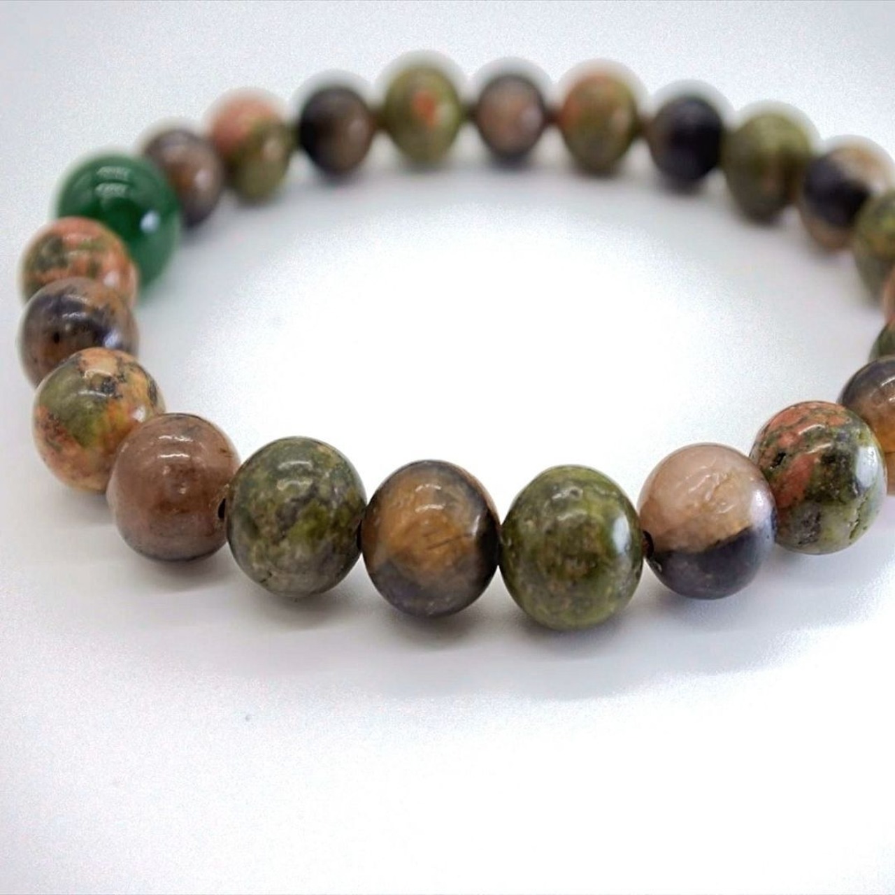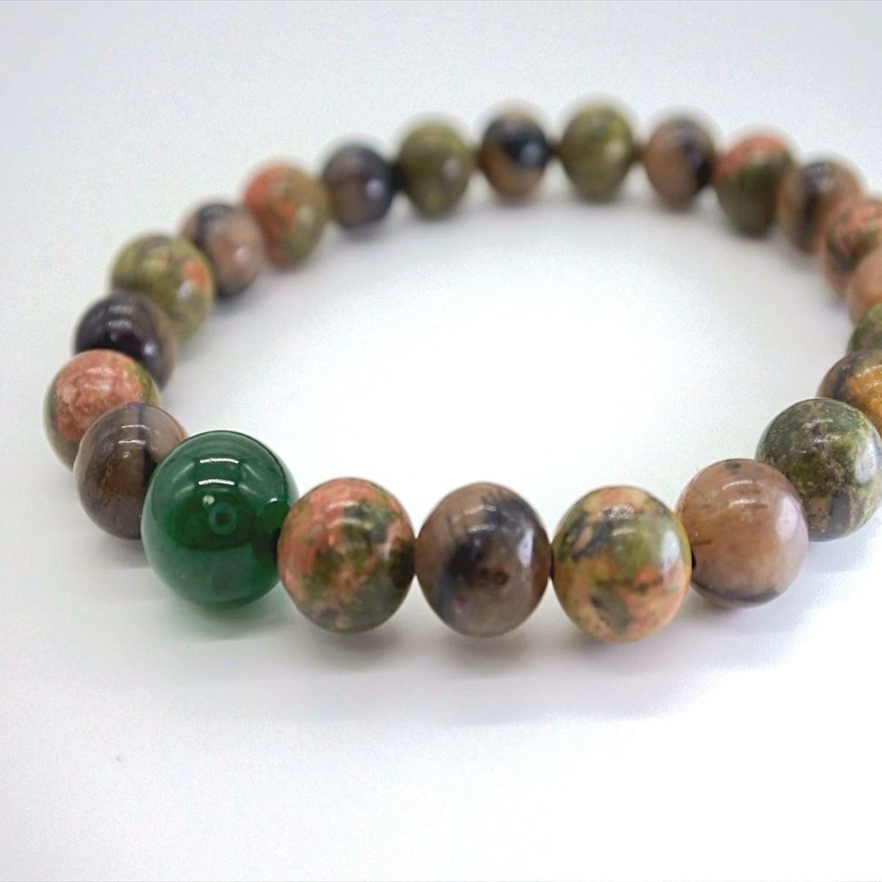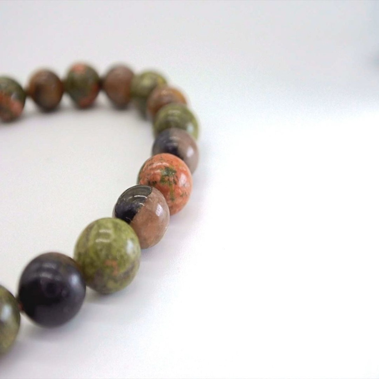 ハートを癒し大地とつなげ、心の安定へと導いてくれるユナカイトは、私自身も助けてもらった、とてもとてもやさしい石ですし、濃い緑色のインドアベンチュリンは緑の森を感じさせてくれます