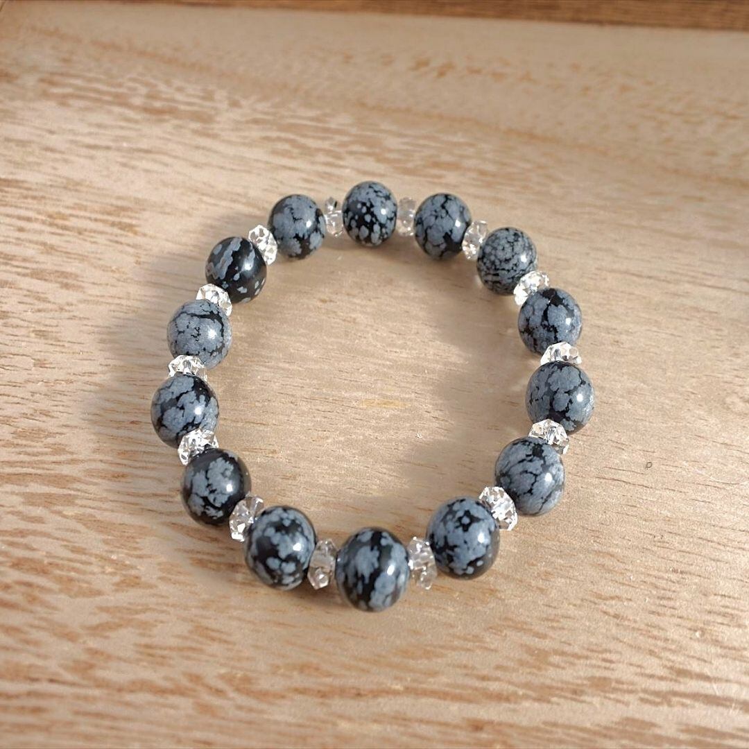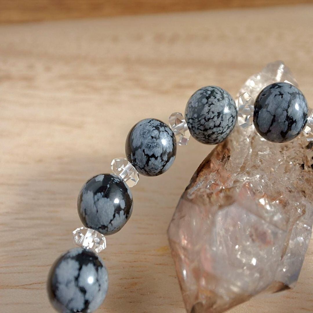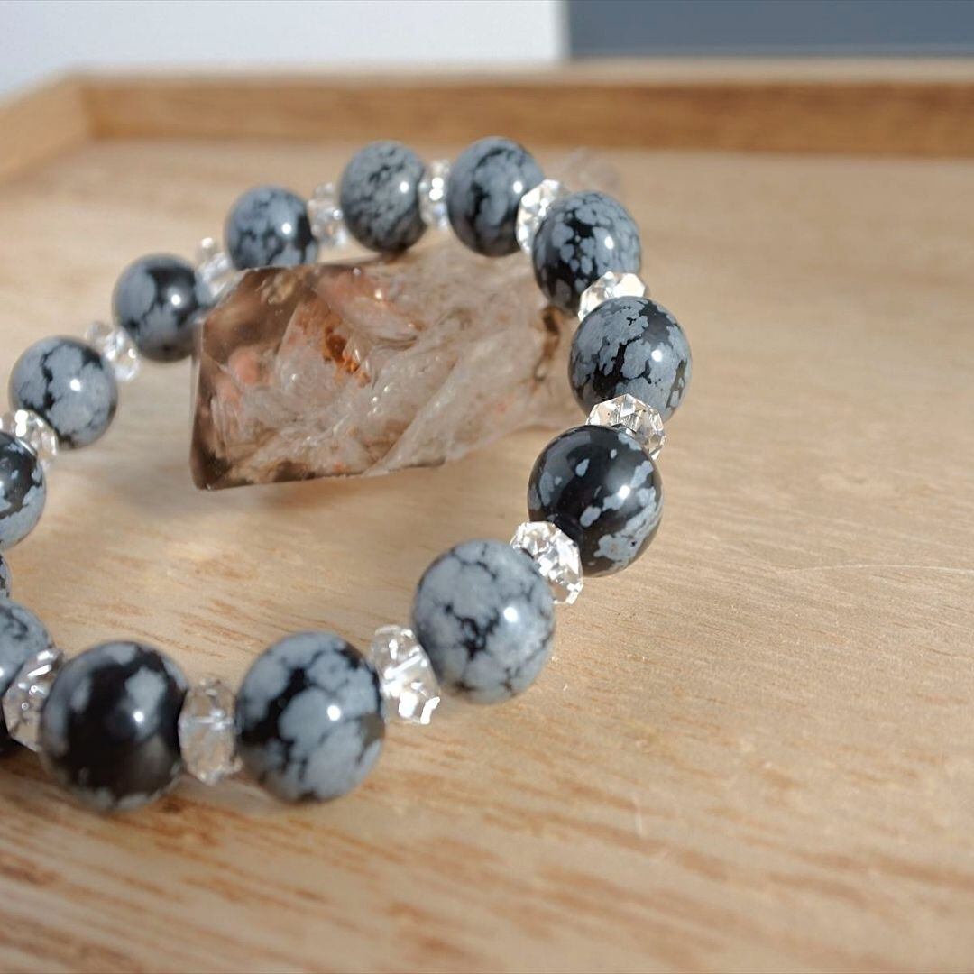 10㎜玉のスノーフレークオブシディアンとボタン型の水晶を交互に配置した、シンプルですが、とてもパワフルなブレスレットです