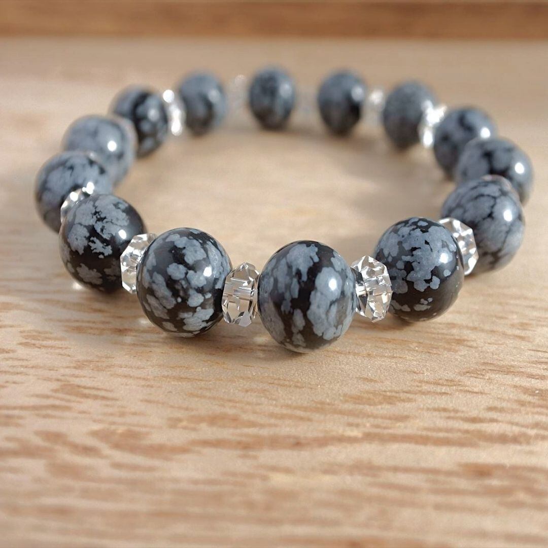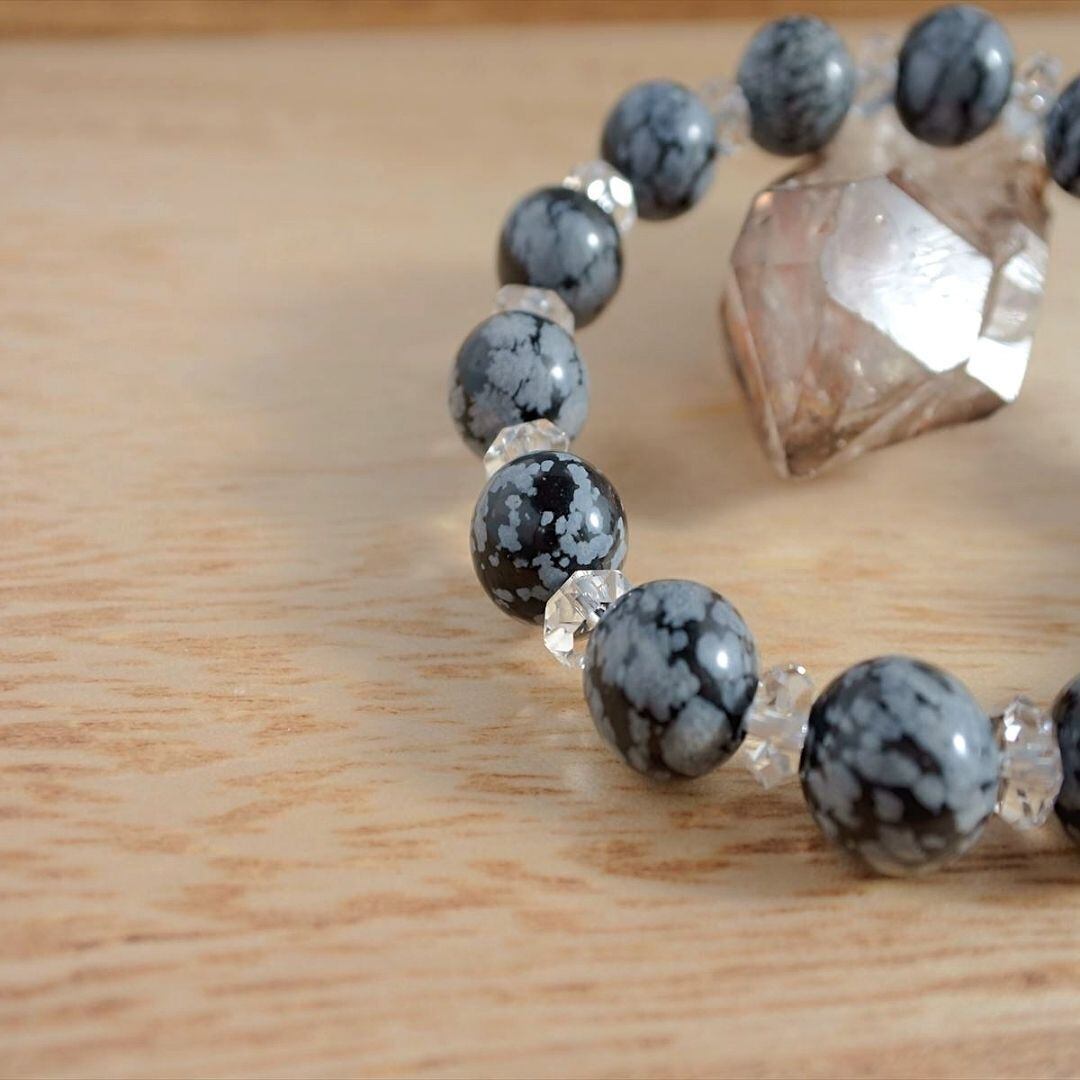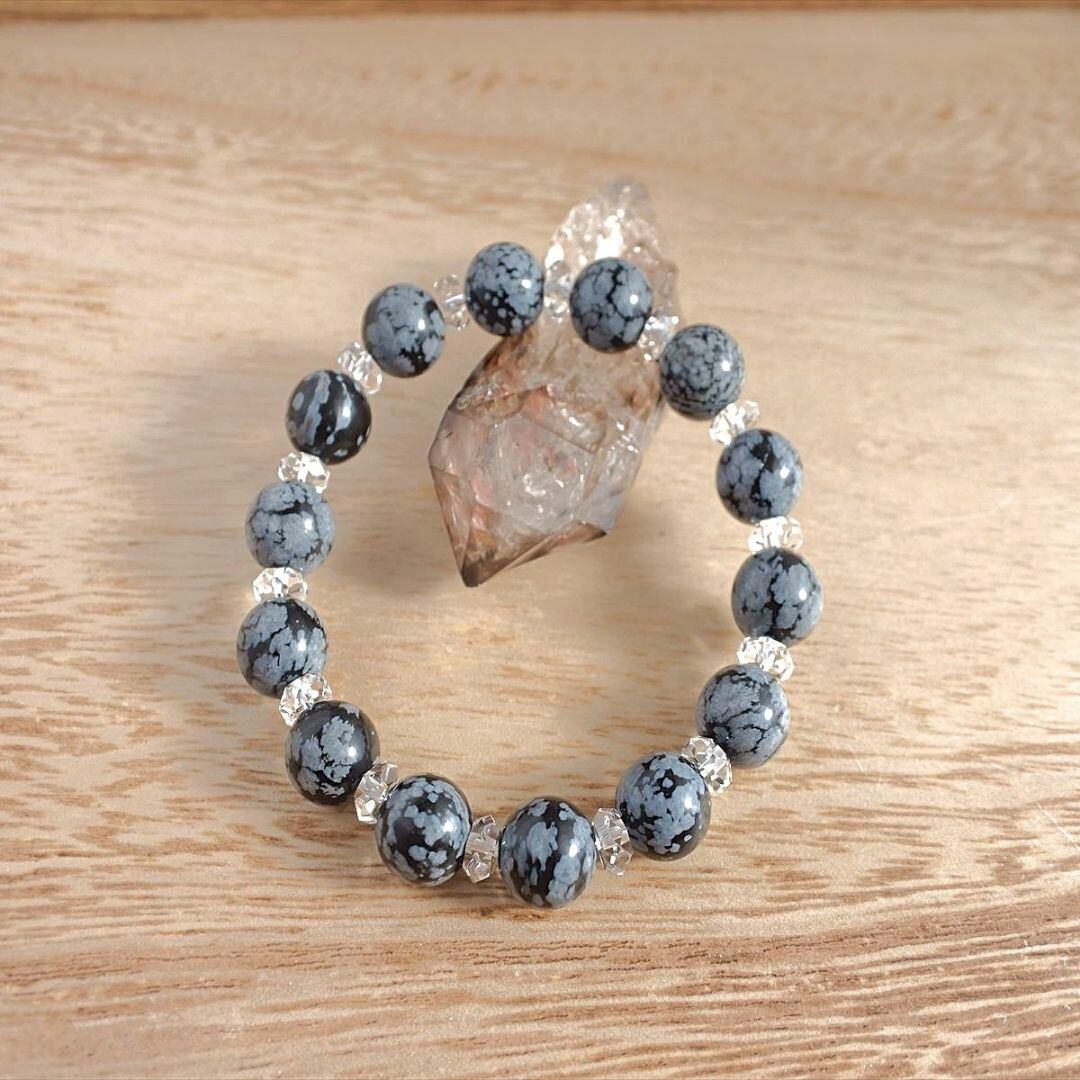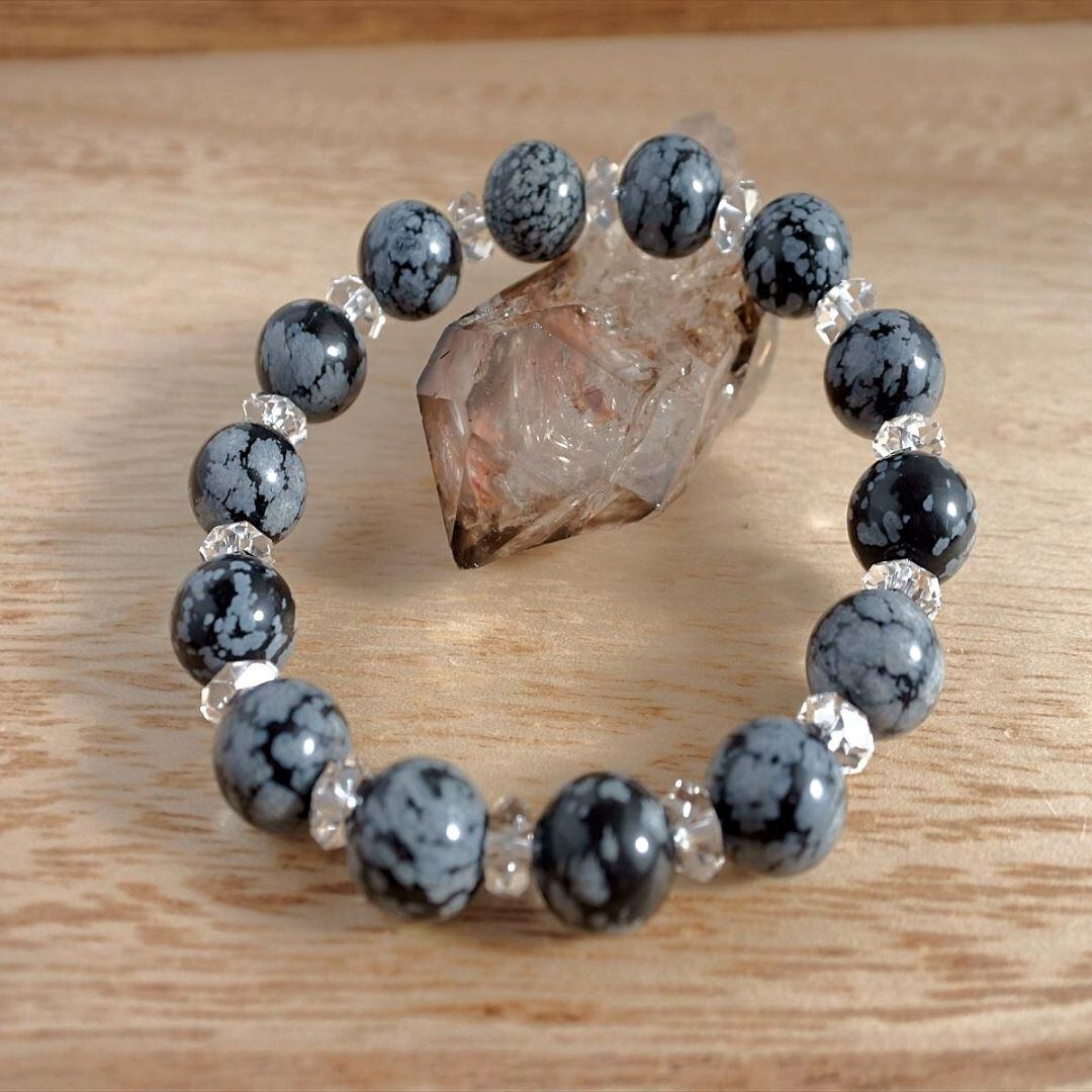 10㎜玉のスノーフレークオブシディアンとボタン型の水晶を交互に配置した、シンプルですが、とてもパワフルなブレスレットです