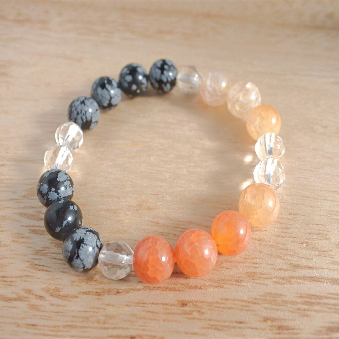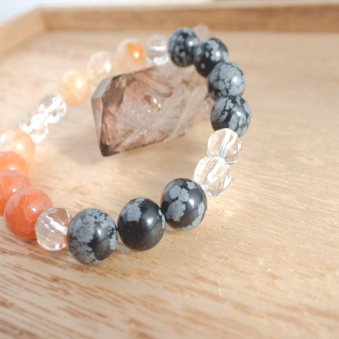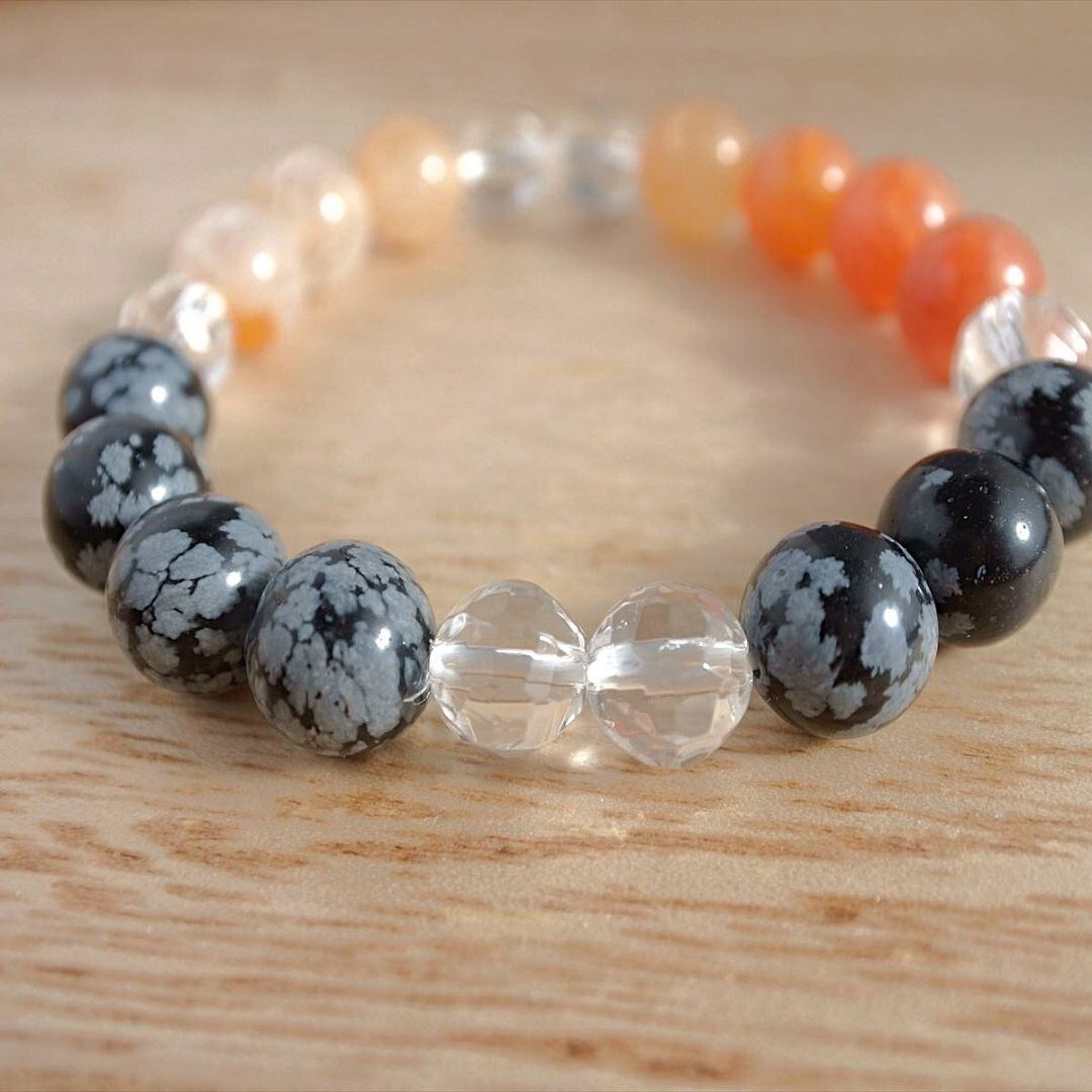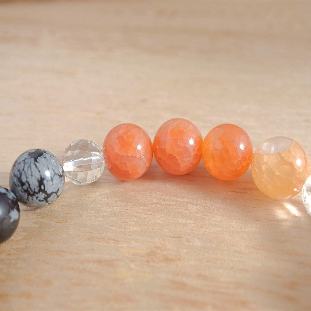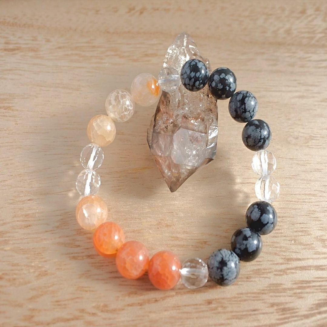 天と地と繋がり、精神的な成長を促すスノーフレークオブシディアンと、守護の力の強い石、ドラゴンアゲート、そしてツイストカットの水晶が明るい光で、あなたの道を照らします