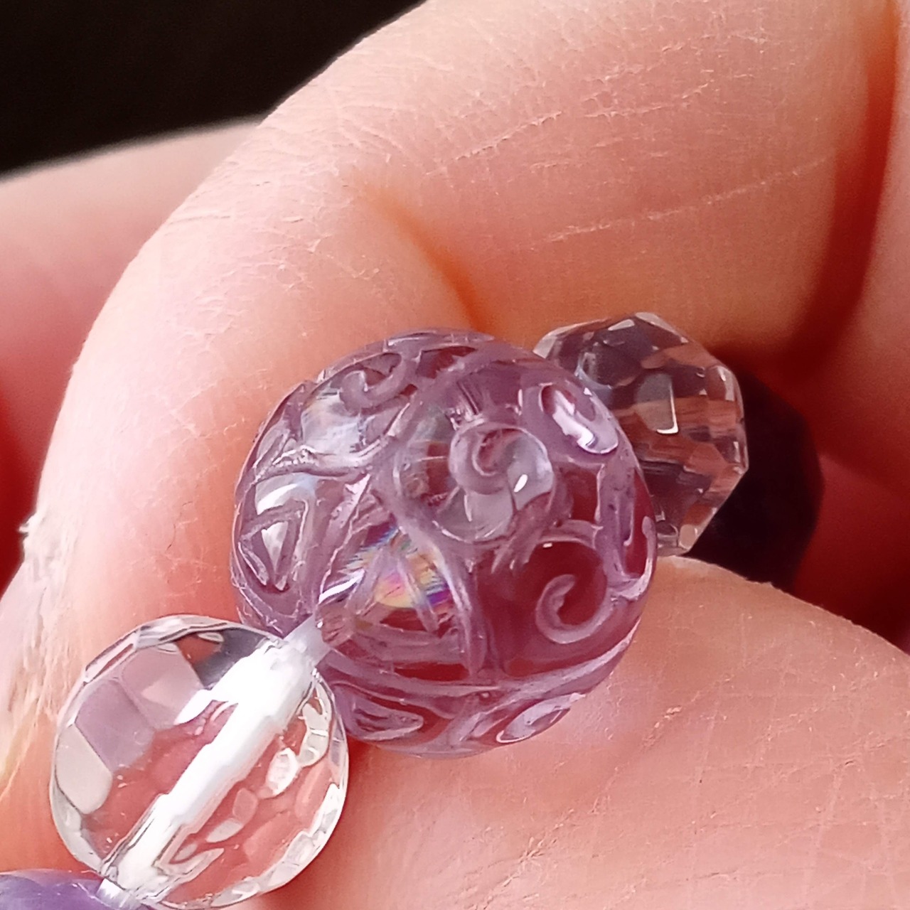 マニ車の柄が彫られたあと12 ミリ玉のアメジストに、希望の象徴でもある虹が現れました
