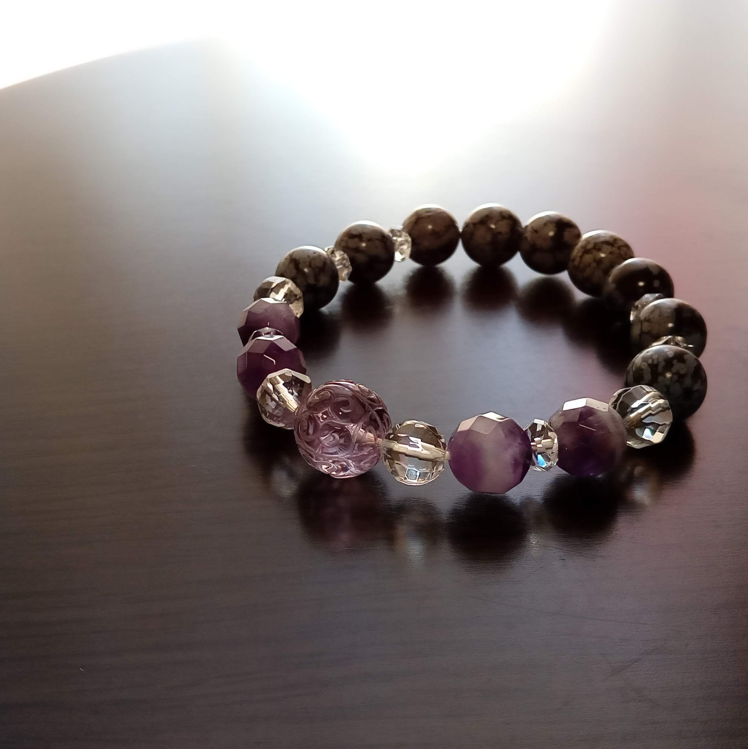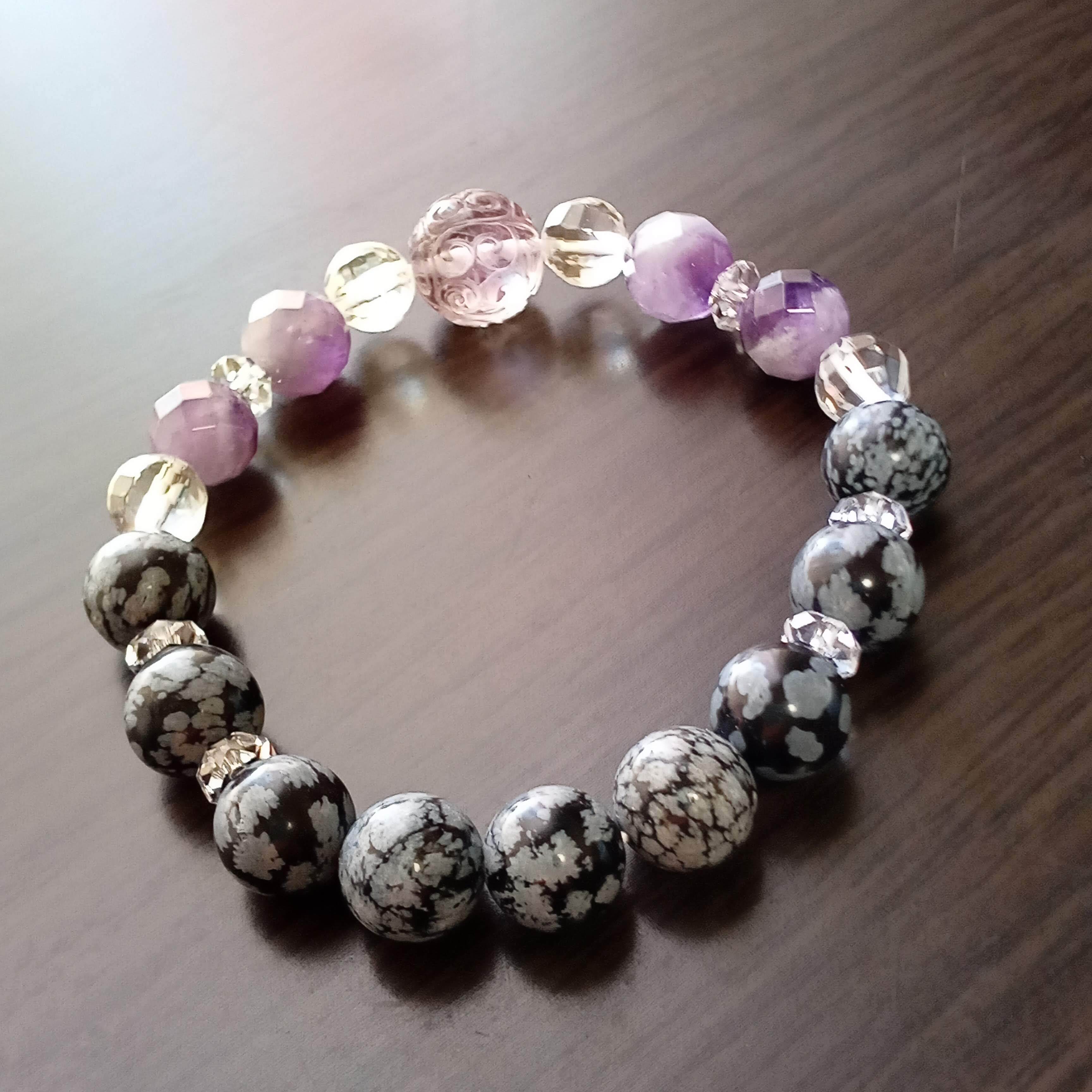 陰陽のバランスのとれたスノーフレークオブシディアンを組み合わせることで、エネルギーの偏りを防いでくれます