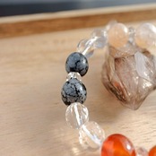 そこに、全体を調和する水晶に、努力する人を見守る龍の名を冠するドラゴンアゲート、源の知識とつながる霊性の高い石、スノーフレークオブシディアンを組み合わせました