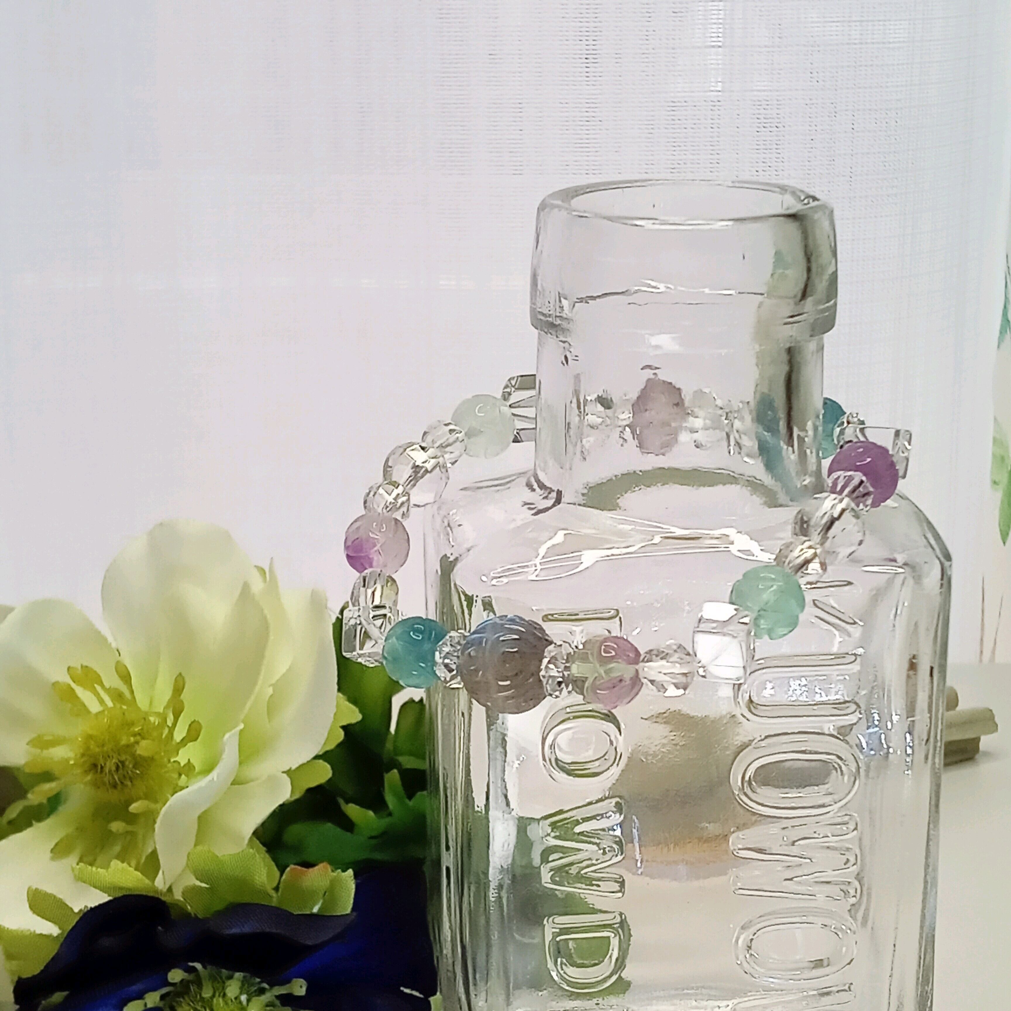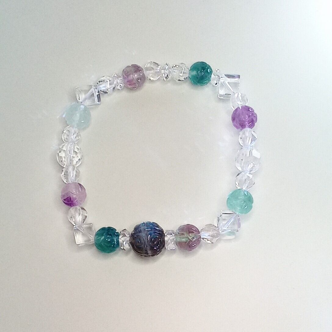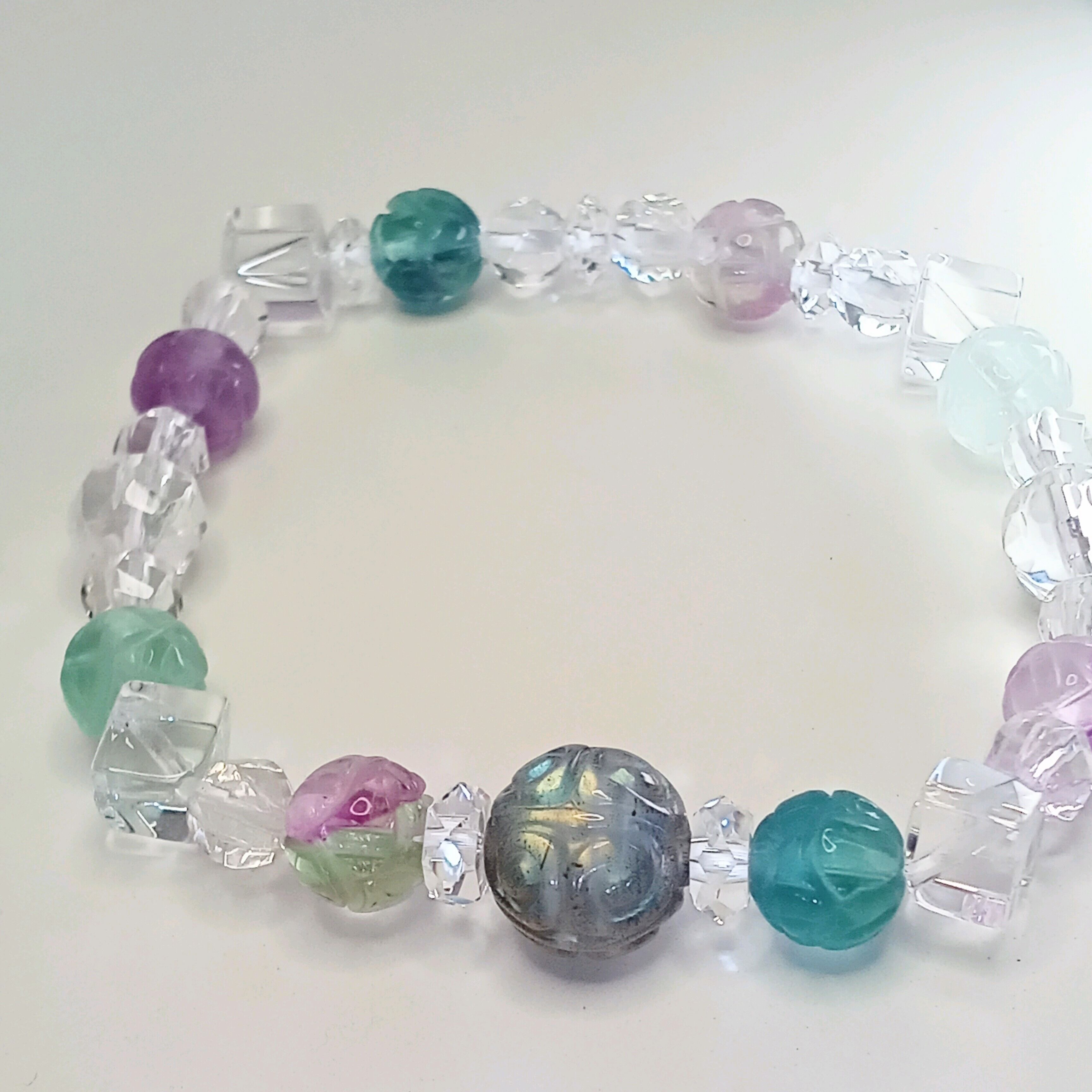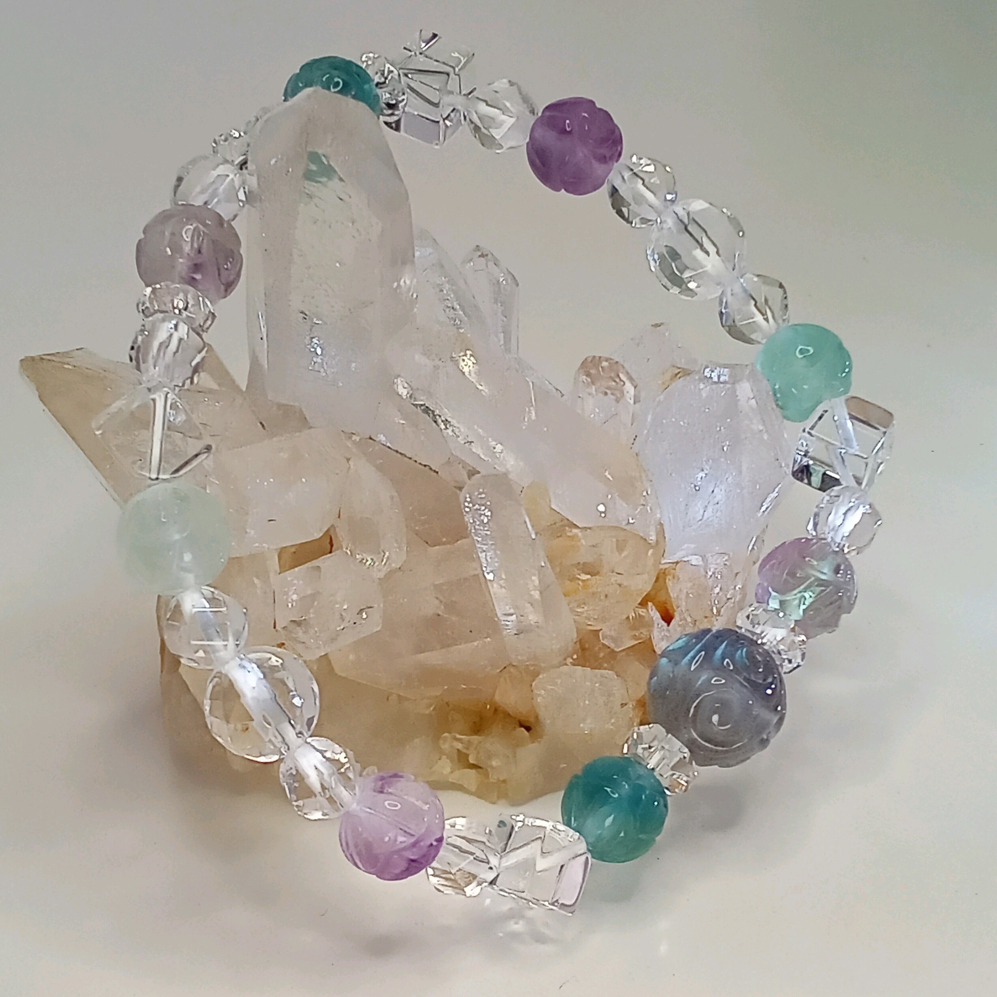 このブレスレットには、あなたの現実創造の足を引っ張る『思考のゴミ』のお掃除を手伝ってくれるフローライトと宇宙とのパイプを作ってくれるラブラドライト、そしてほかの石たちのパワーを増幅してくれる水晶を組み合わせ